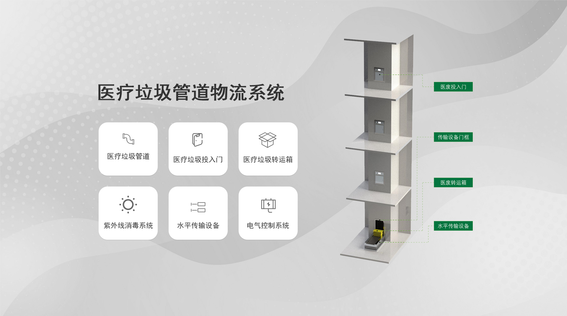 系統簡介:通過氣力式輸送管道對醫院內的垃圾和污衣被服進行收集,是一種對垃圾實行全封閉、壓縮化、集裝化收運的現代垃圾運輸及匯集方式...